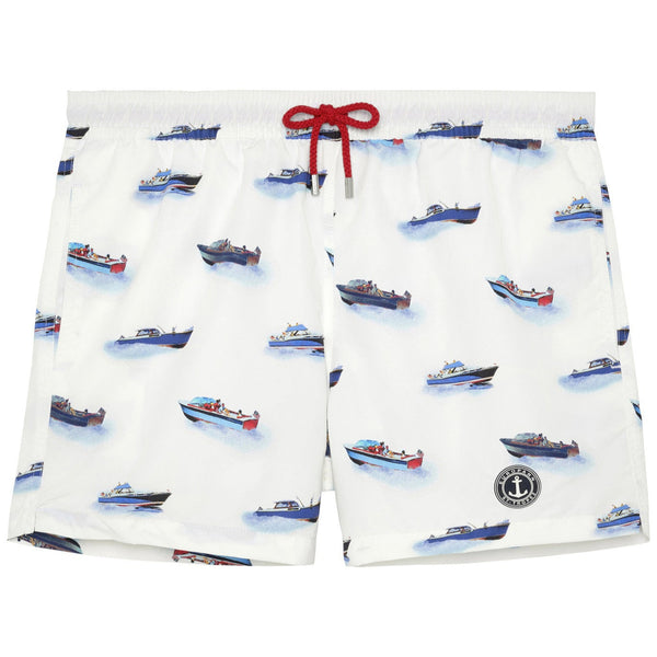 The Short Cut Boat Print RIVE Swim Trunk in Ocean from EUROPAAN: Elasticated waistband Size with a neutral drawstring and two stainless steel tips Short Cut Side pockets Welt back pocket...