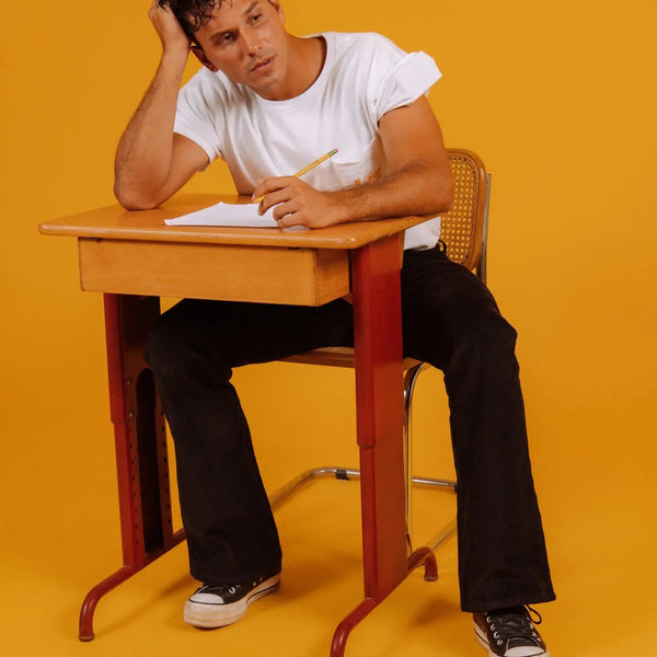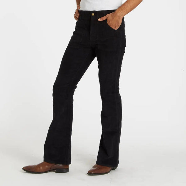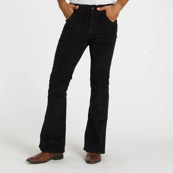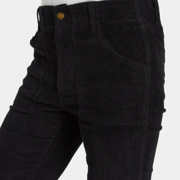 The Stretch Corduroy Bell Bottom Pant in Black from Hammies: Crafted from a stretch corduroy fabric Tailored fit 11"-12" flair Square panel pockets Belt loops Copper tack & zipper closure...