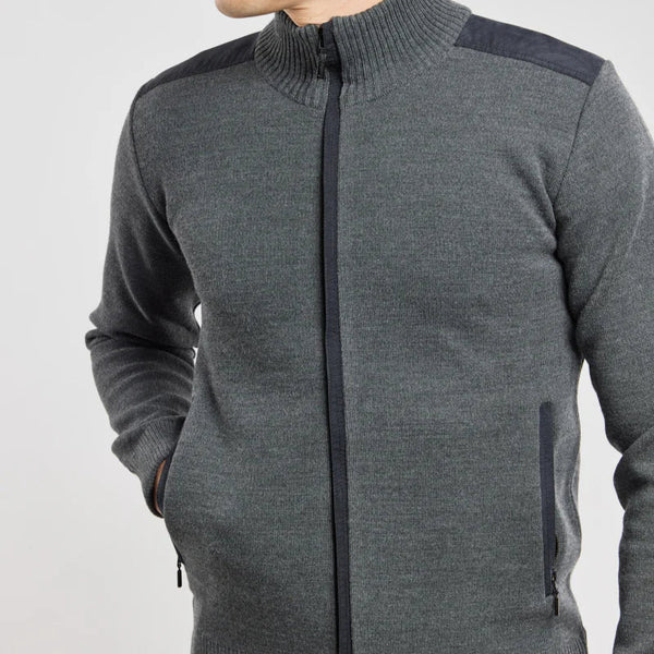 The Full Zip Cardigan Sweater in Grey from ArmorLux: Full zip cardigan Heavy interlock knit High collar Double ripped hem and cuffs Suede patches at shoulder and elbow 50 wool...