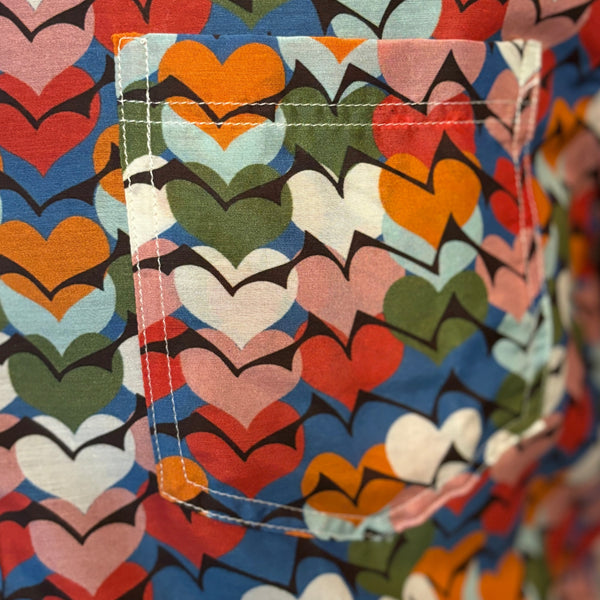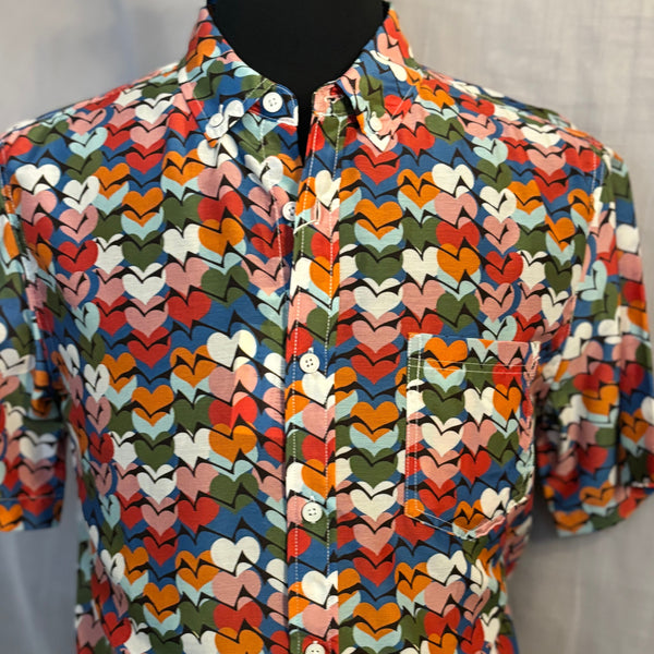 The Short Sleeve Silk & Cotton Multi-Color Hearts Print Shirt on a Dark Background from Oxford Lads: Crafted from luxe silk & cotton printed fabrics resembling true works of art Front...
