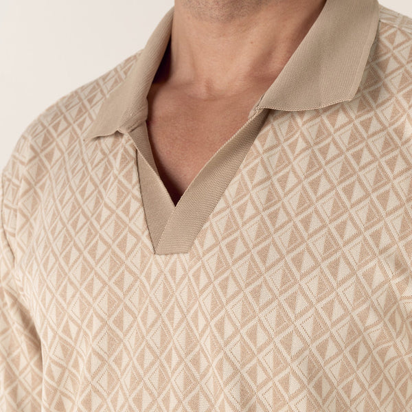 The Short Sleeve Geometric Jacquard Portofino Polo in Cream form Europann: Crafted from a super soft luxe jacquard fabric Ribbed johnny collar & cuffs 2-side vents Engraved logo badge on...