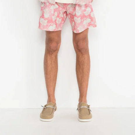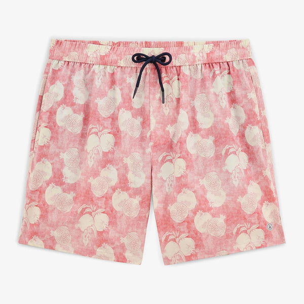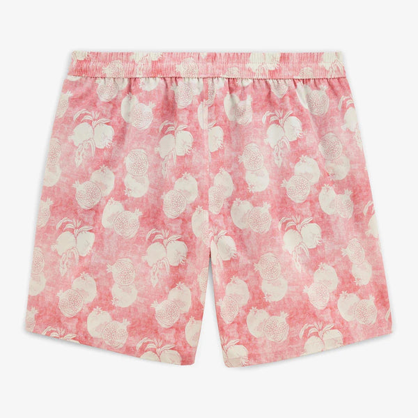 The Pomegranate Print Swim Trunk in Rose from Serge Blanco: Elasticated waistband Drawstrings at the waistband for a perfect fit 2 side pockets Side slits Tricolor logo badge on left leg...