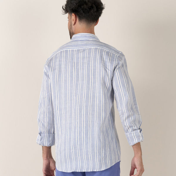 The Long Sleeve Striped Italia Shirt in Ocean Blue from Europann: Crafted from a luxe linen blend fabric Modern fit Spread collar Pearl buttons Rounded bottom hem Long sleeve 48% linen...