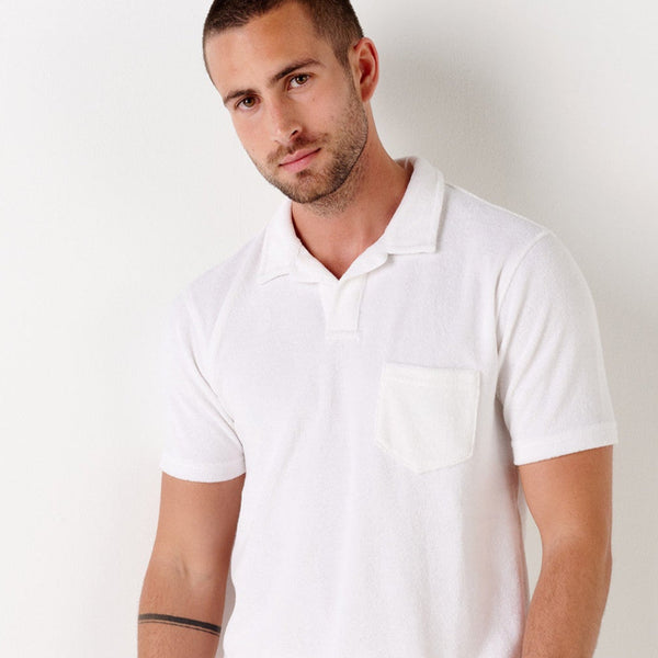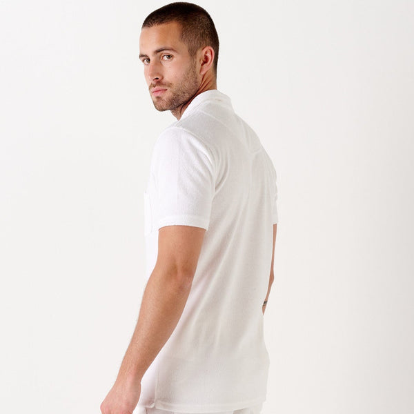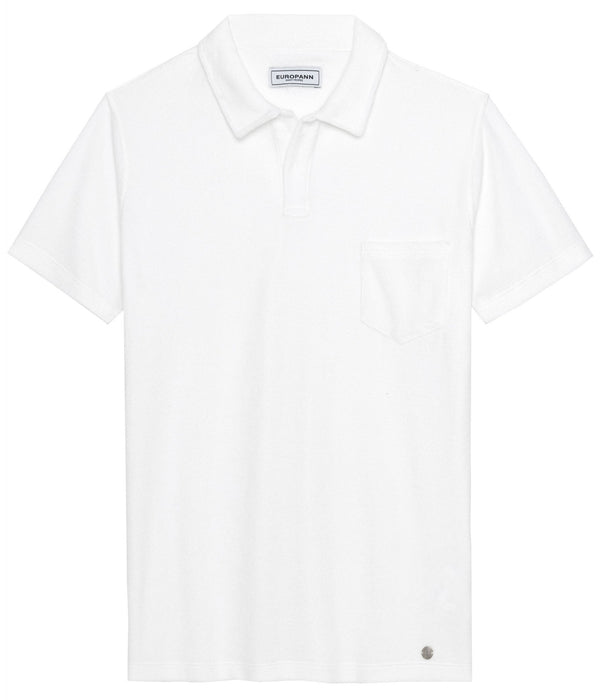 The Short Sleeve Terry Cloth Mitch Polo in White from Europann: Crafted from a soft & comfortable cotton blend terry cloth fabric Soft collar johnny collar design Front chest pocket...