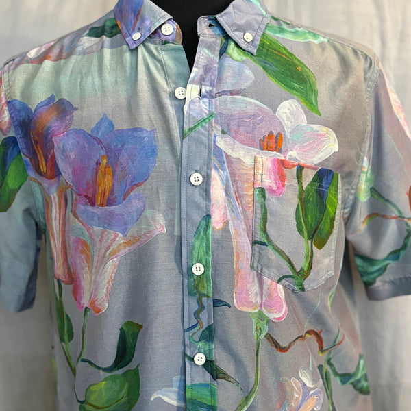 The Short Sleeve Silk & Cotton Watercolor Trumpet Flower Print Shirt in Blue from Oxford Lads: Crafted from luxe silk & cotton printed fabrics resembling true works of art Front button...